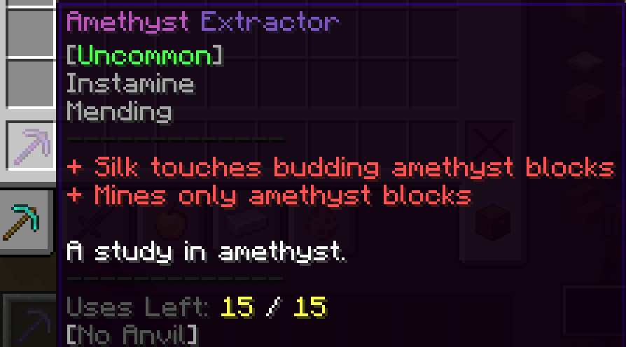 - Mine upto 15 budding amethyst, once the 15 blocks are mined you can still use on normal amethyst