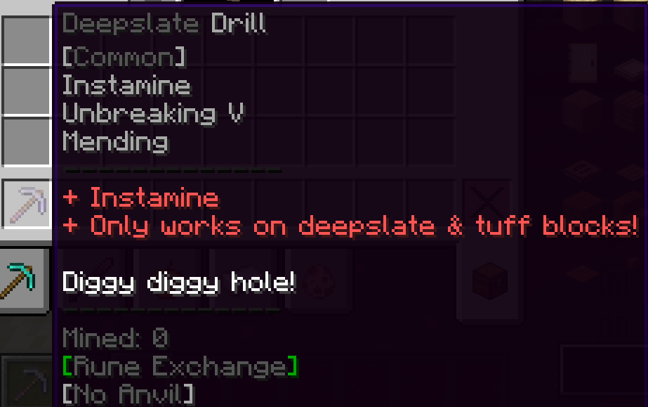 The Deepslate Drill is an Common mystic crate item, this can be obtained from the Mystic Crate v1 and is a greate item to use when clearing large areas! This item with a level 2 beacon is the fastest mining tool on the server. Has low durability but it sure does mine fast!