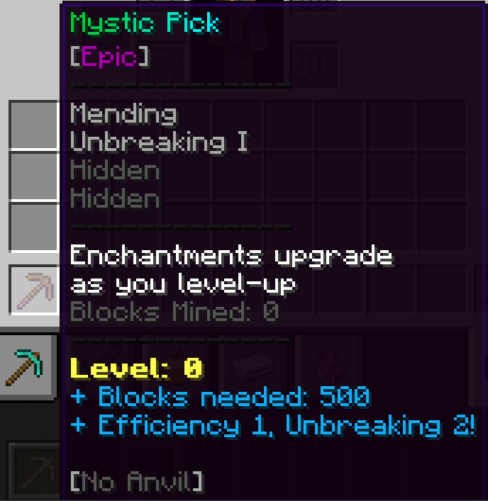 The Mystic Pick is an Epic Mystic Crate Item, that can be obtained from the Mystic Crate v1. This item is considered the best tool on the server for overall mining. There is a leader board located at spawn showcasing the top "blocks mined" players. To add your mined count to the list, have the tool in your main-hand and log off the server. The leaderboard reloads every 60 minutes!
