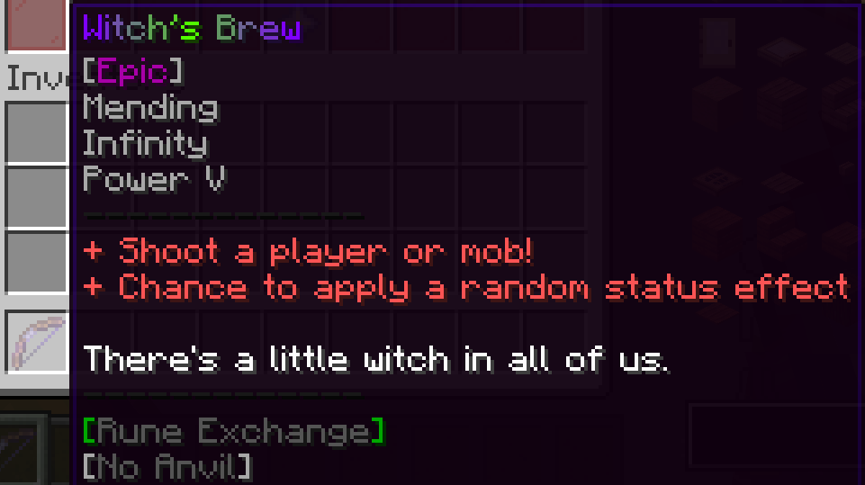 Brief Summary: Applies a random potion effect to the victim hit by the arrow. Infinity + Mending. Check the "custom attributes" listed below to learn more about which potion effects can be applied.